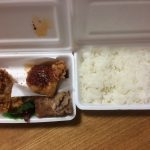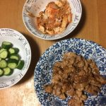 豚バラと玉ねぎを炒めたもの、キュウリの漬物、カジキマグロとキムチをゴマ油とお酒で味付けして、レンジで蒸したものです。