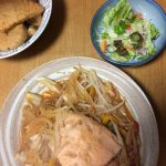 今日の夕ご飯は自己流ちゃんちゃん焼きとサラダ、おでんの練り物をめんつゆで煮たものです。